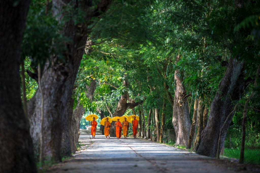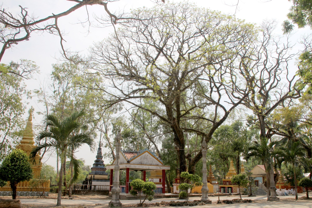 Hang Cong Pagoda’s official name is Prochum Meáp ChhƯm Kiriram, located in Chau Lang Commune, Tri Ton District, An Giang Province. In Khmer, “Prochum Meáp ChhƯm Kiriram” means “the temple in the middle of the mountain.” The name Krang Kroch comes from its original location on a high mound filled with wild pomelo trees (where “Krang” means mound, and “Kroch” means wild pomelo). However, the most distinctive feature of this temple is the row of ancient rain trees, leading to the affectionate local name “Hang Cong Pagoda.”