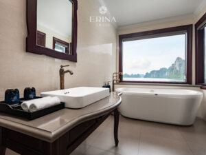 Entering Family Suite, you can immediately feel a sense of balance. Its zen aura is seen via the interiors’ setup, color arrangement, and spacious balcony. The suite can accommodate up to 4 guests and offers an en-suite bathroom with an ocean-view bathtub, ensuring quality time in privacy to unwind with friends or family.